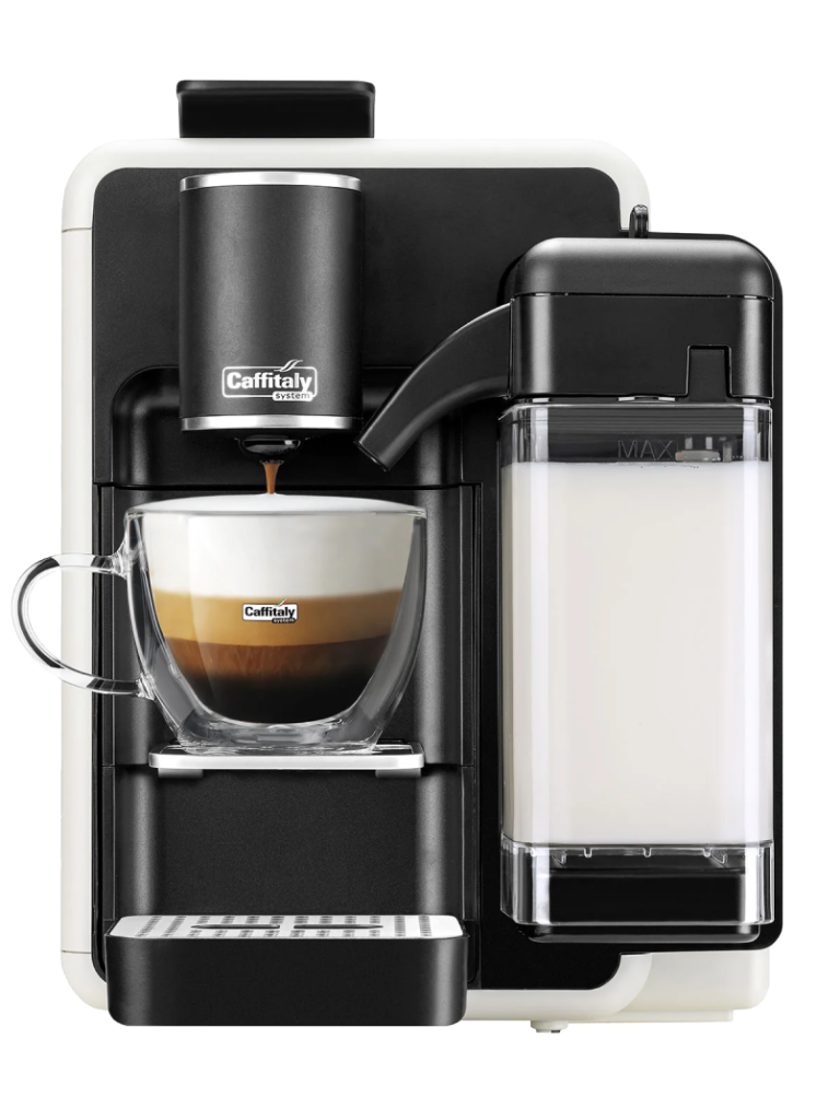 „Quadra Caffitaly“ kavos aparatas su integruotu pieno putos plakikliu , leidžiančiu vienu mygtuko paspaudimu sukurti šešis skirtingus gėrimų tipus.